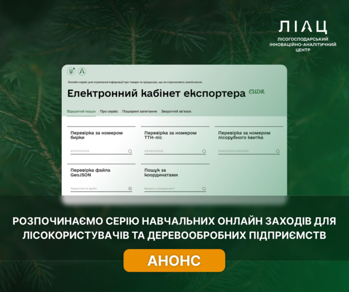 Онлайн заходи проводить ДП «ЛІАЦ» у співпраці з Міжрегіональними управліннями лісового та мисливського господарства Держлісагентства. Під час навчання фахівці презентуватимуть функціонал Електронного кабінету експортера та пояснюватимуть, як із ним працювати.